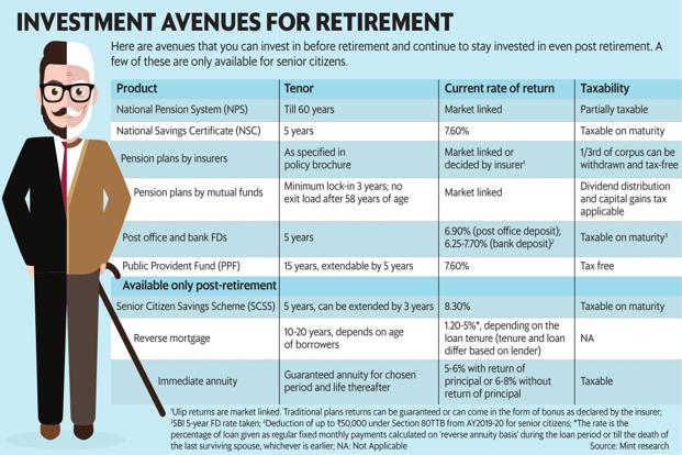 Among traditional investment choices for senior citizens are bank fixed deposits, Senior Citizen Savings Scheme (SCSS) and National Savings Certificate (NSC). Bank FDs give senior citizens an advantage by giving an interest rate that is 25-50 basis points higher than what other individuals get. The 8.3% interest on SCSS is also attractive. One basis point is one-hundredth of a percentage point.